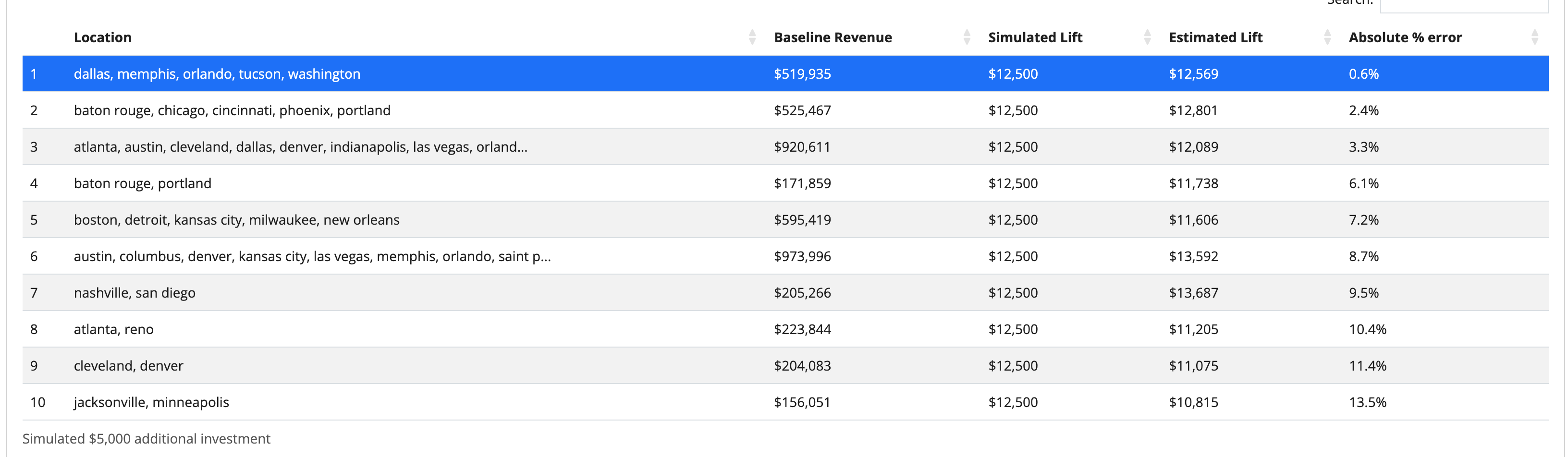 Click âDetermine test marketsâ when you are ready. Recast will analyze your data and provide options for various experiment configurations which you will be able to select from. GeoLift ranks the experiment options in terms of the difference between the simulated lift and the lift estimated. If Recast is unable to find test groups that result in low error and statistical significance, it will fail to generate the candidate test markets and instead recommend tweaking your settings. Increasing the spend amount, changing the number of days (for the same amount of total spend, a shorter test will be more powerful than a long test), and changing the number of test markets are all ways to increase the statistical power.
